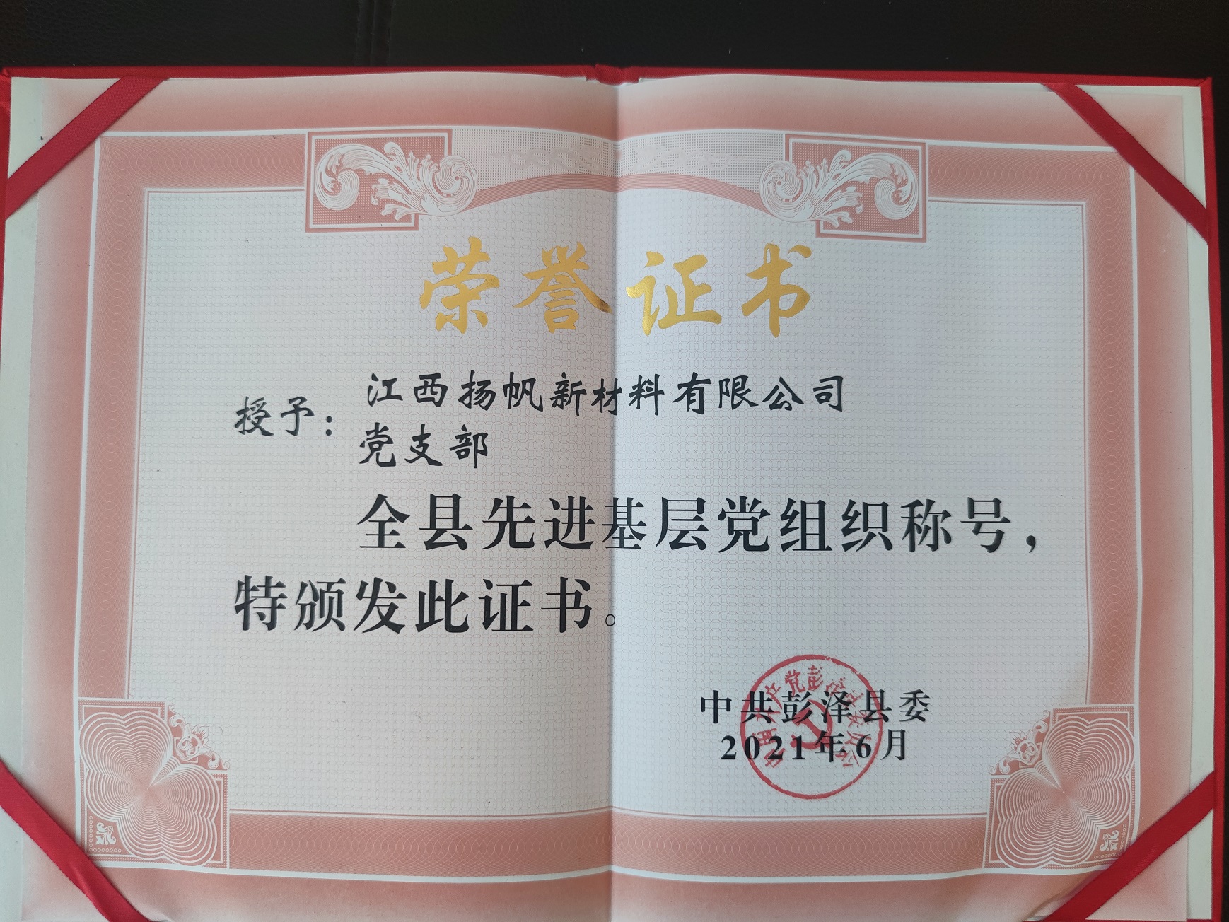 近日,為慶祝建黨100周年,中共彭澤縣委做出關于《表彰彭澤縣優秀共產黨員、優秀黨務工作者和先進基層黨組織的決定》。江西揚帆新材料有限公司黨支部榮獲“全縣先進基層黨組織”榮譽稱號。
