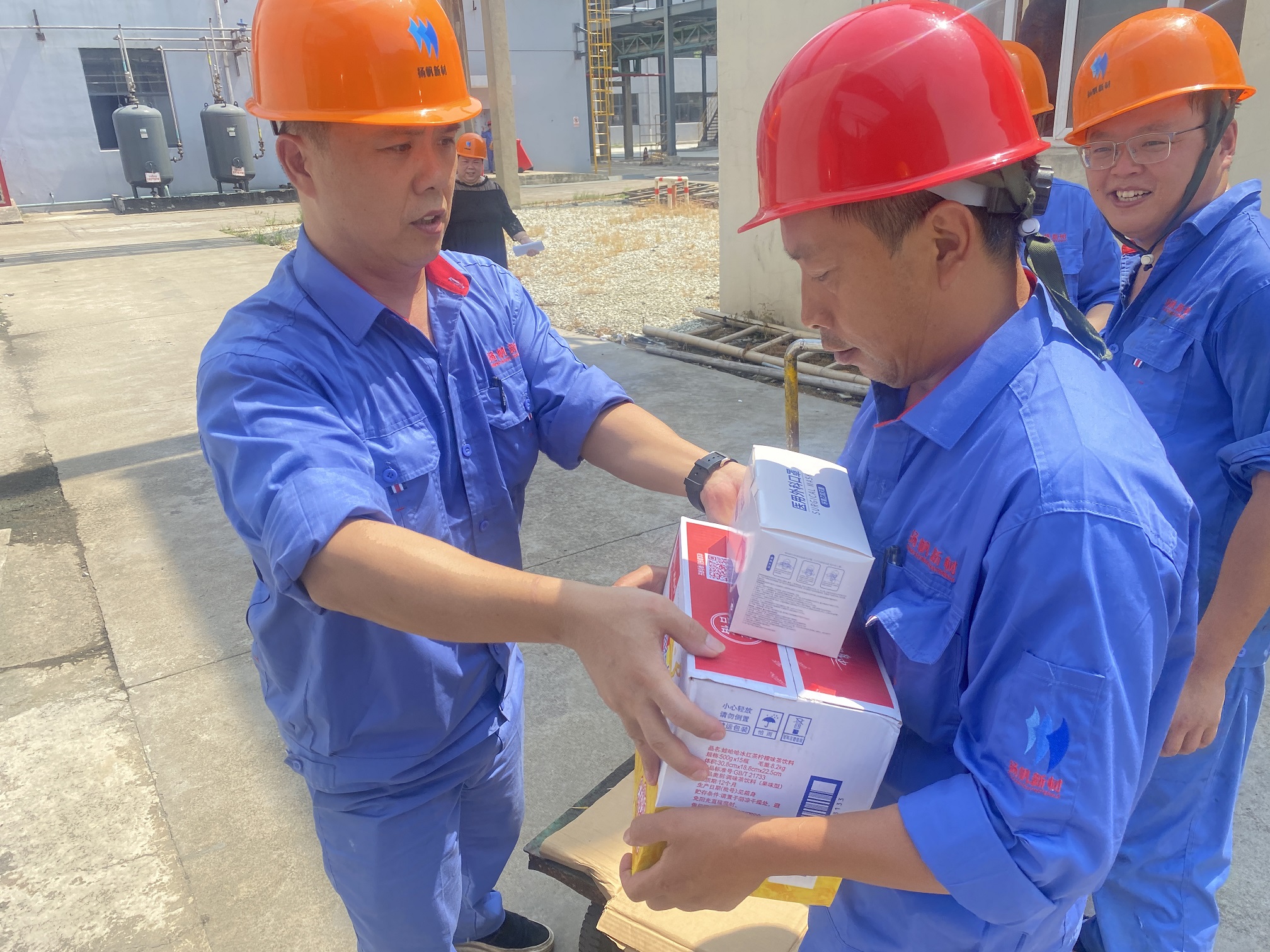 726日下午,揚帆新材上虞生產基地工會開展送清涼活動。工會委員李琴帶隊,在各車間主任的陪同下向各車間和倉庫奮戰在一線的職工送上“清涼”冷飲。