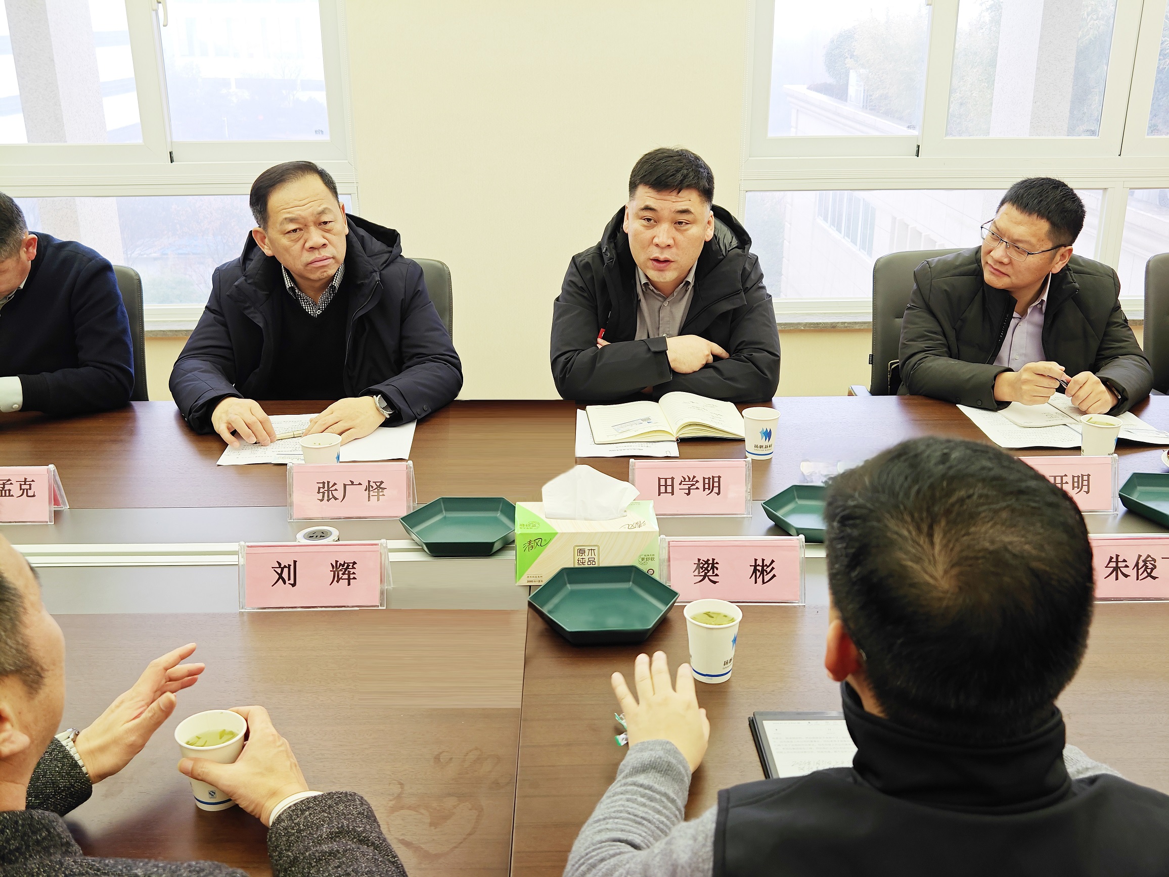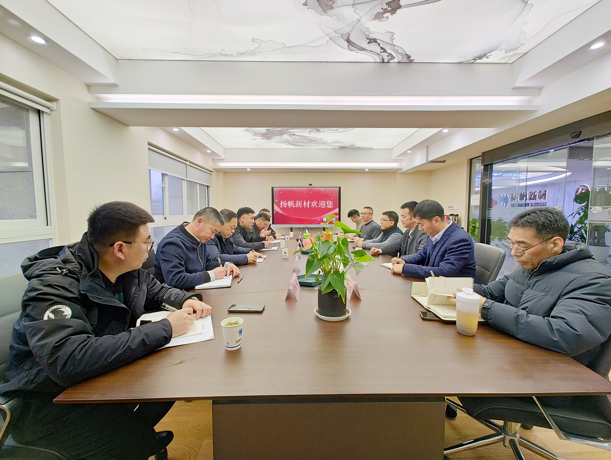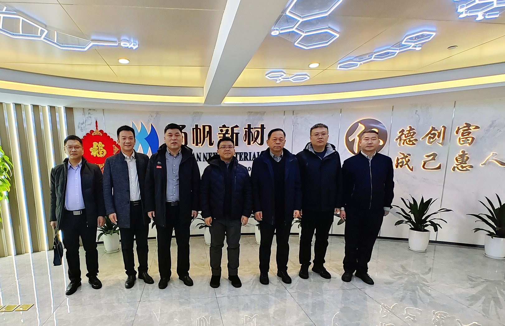 1月31日,內蒙古阿拉善高新技術產業開發區黨工委副書記、管委會主任田學明一行到揚帆新材杭州總部走訪慰問。公司董事長、總裁樊彬,常務副總裁劉輝等接待并陪同調研。
