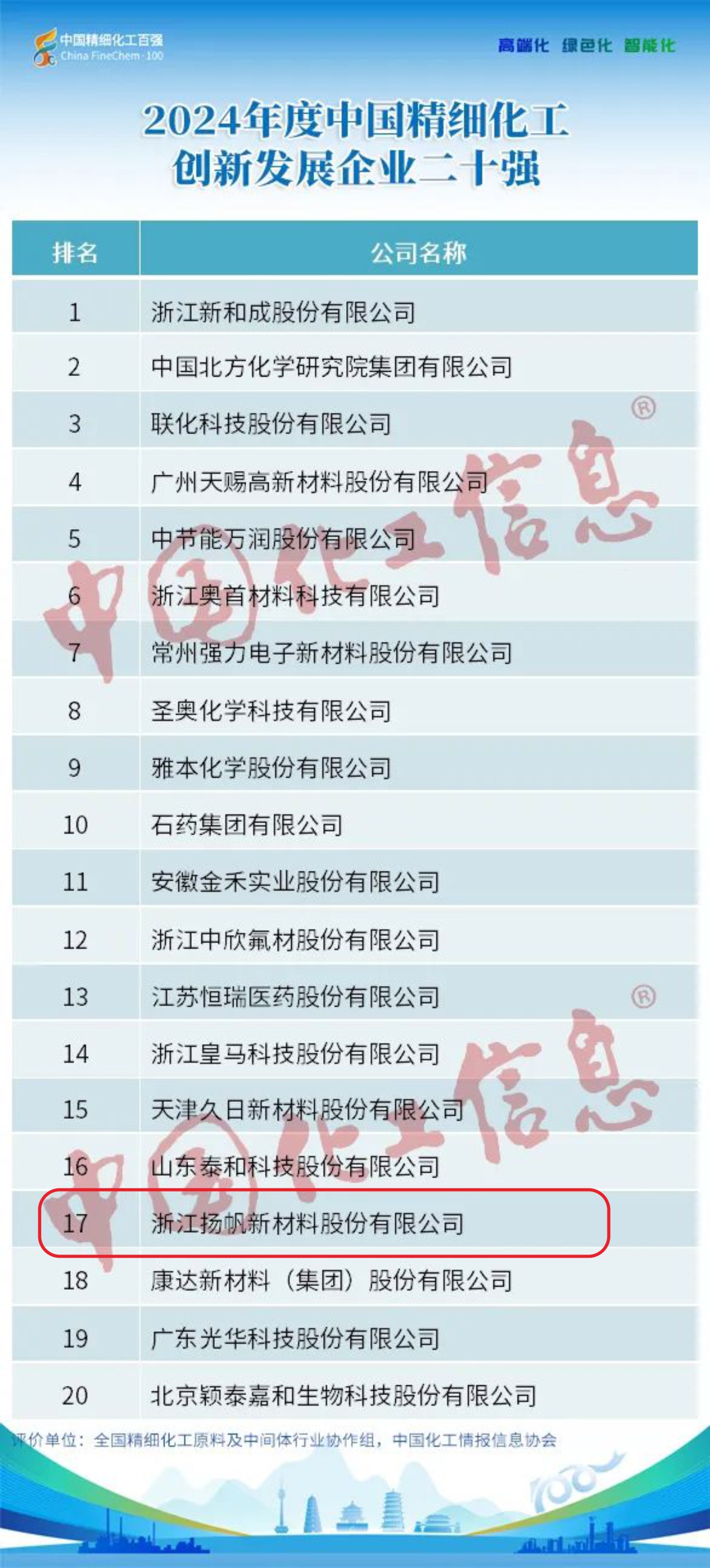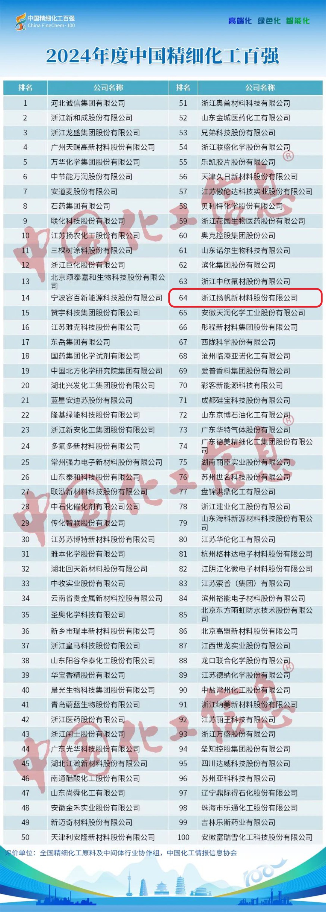 浙江揚(yáng)帆新材料股份有限公司再度榮登“中國(guó)精細(xì)化工百?gòu)?qiáng)”,位居第64位,排名較去年上升9位。
