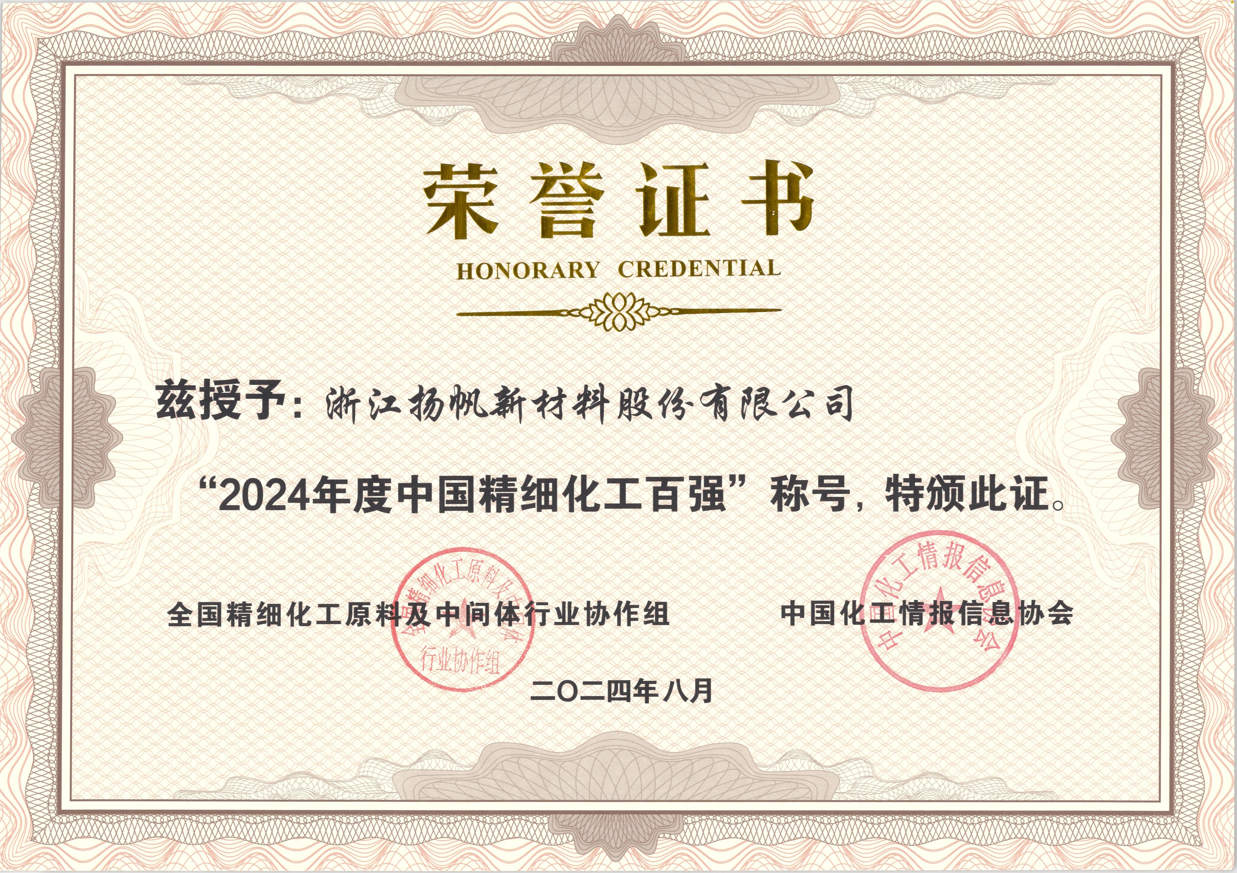 此外,公司榮登“2024年度中國(guó)精細(xì)化工創(chuàng)新發(fā)展企業(yè)二十強(qiáng)”,位居17位。