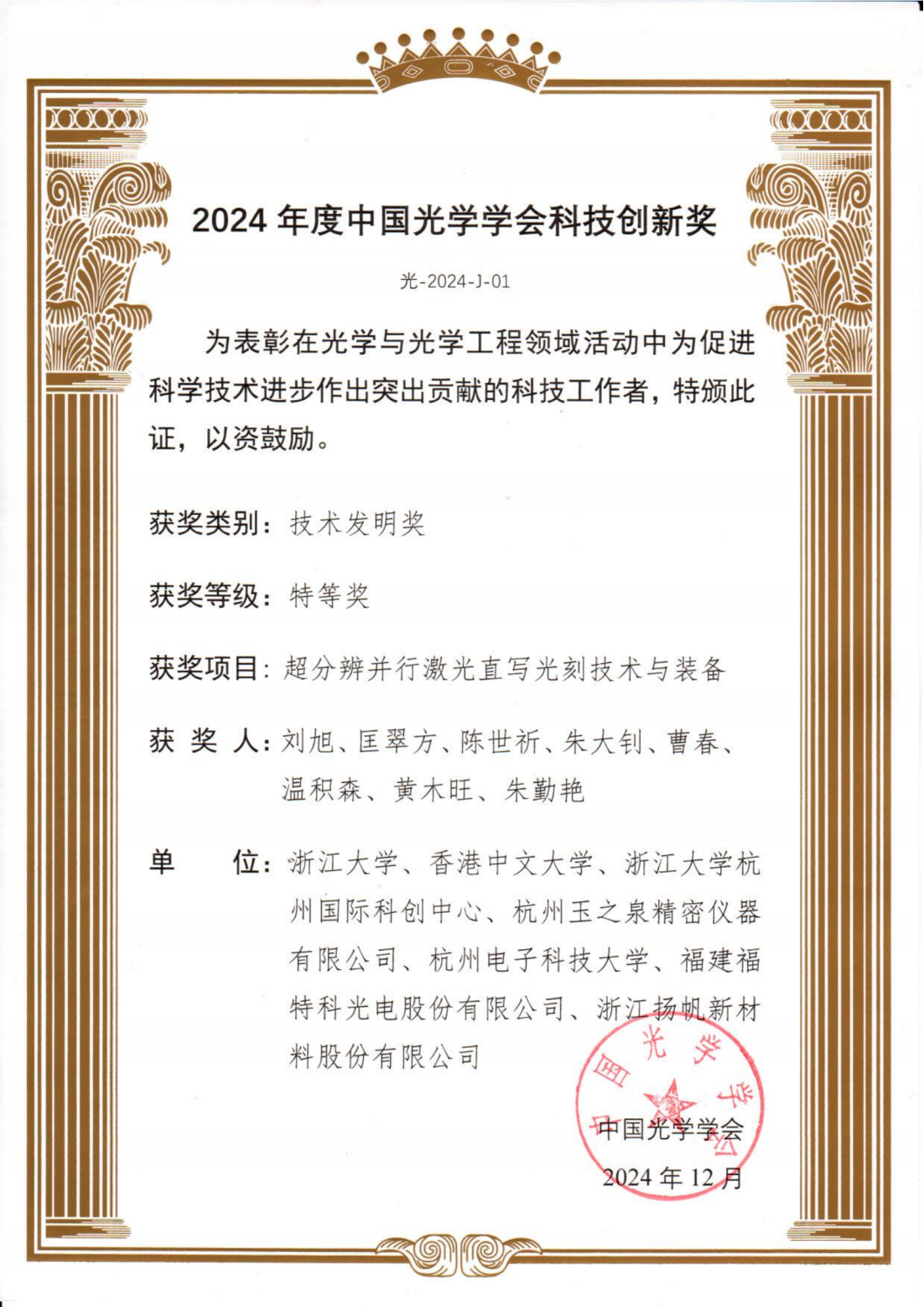 近日,中國(guó)光學(xué)學(xué)會(huì)公布了“2024年度中國(guó)光學(xué)學(xué)會(huì)科技創(chuàng)新獎(jiǎng)評(píng)選結(jié)果”,我司作為參與單位,參與“超分辨并行激光直寫(xiě)光刻技術(shù)與裝備”項(xiàng)目研發(fā),并榮獲科技創(chuàng)新獎(jiǎng)特等獎(jiǎng)。